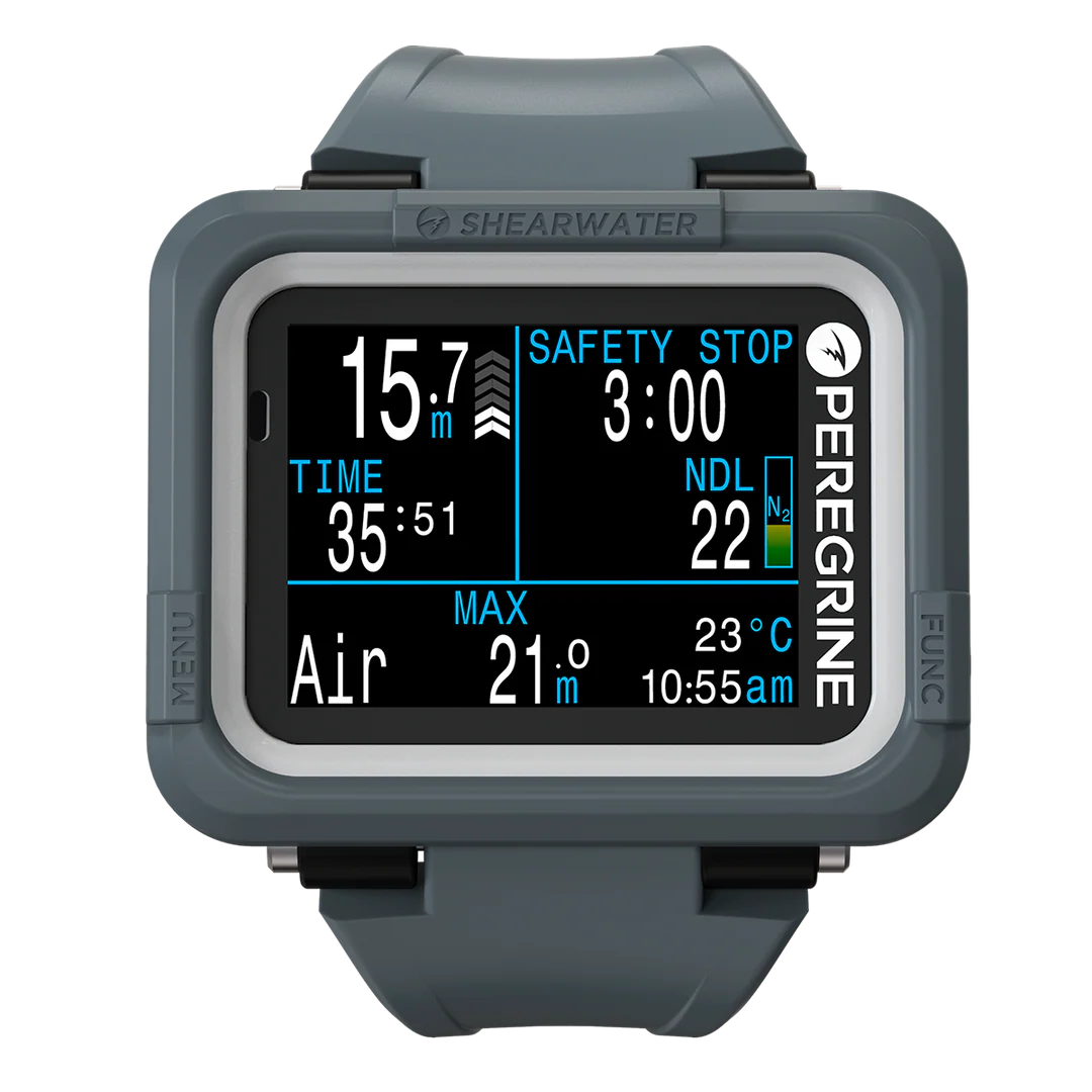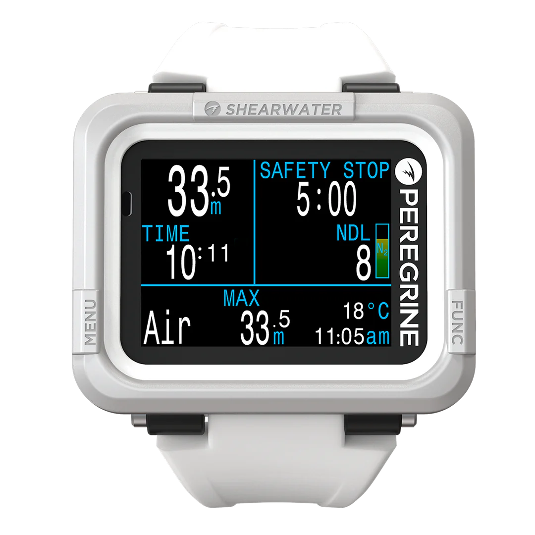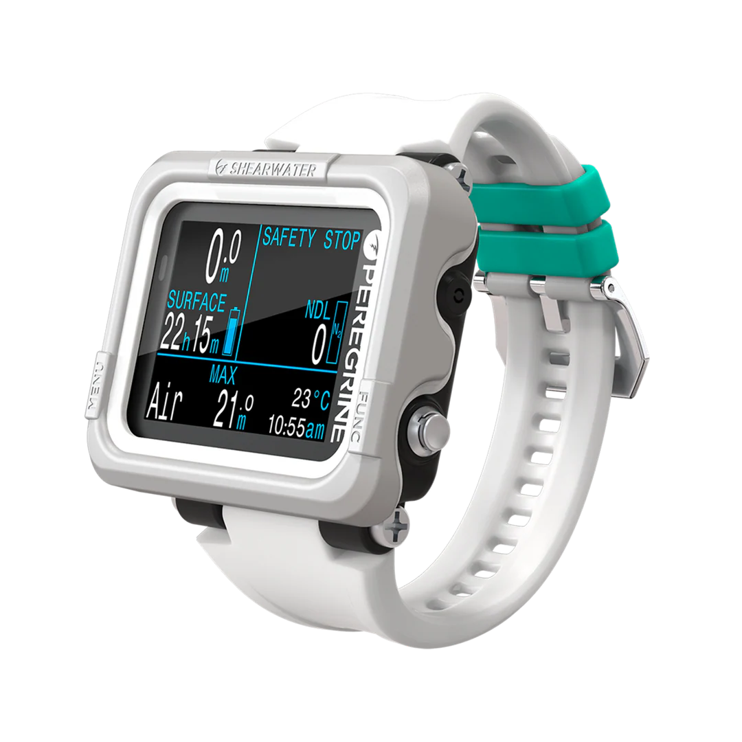 The Shearwater Peregrine is a full-color, multi-gas dive computer designed for easy use by divers of all levels. It features a simple interface and essential functions, including air integration and a digital compass in the PEREGRINE TX model, making it a reliable companion for your diving adventures.